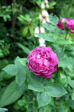 濃いピンクの薔薇は、President de Seze。青みがかったマゼンタピンクは花の中心から外側へとグラデーションし、遠くからも一目をひく印象的な薔薇です。