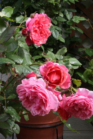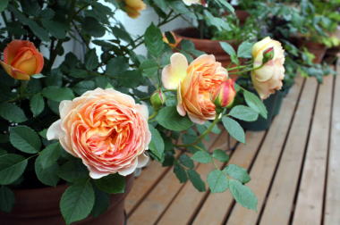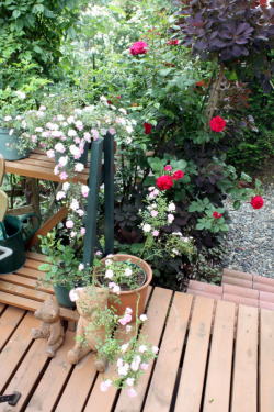 ウッドデッキの鉢植えの薔薇達も元気よく咲いてくれました。