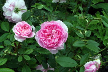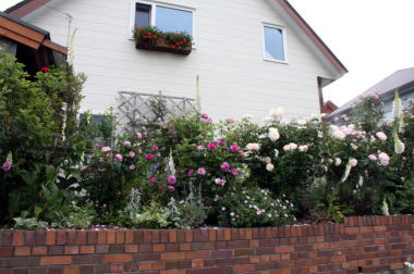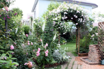 家の南の庭は、前の家があるため実は日陰の庭。ここには日陰に強い薔薇と花々が植えられています。