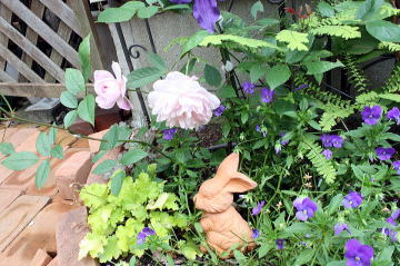 左奥の薄ピンクはERのつるバラ、The Generous Gardener。この薔薇の優しいピンク色もここの雰囲気にぴったり。四季咲きで日陰にも強く、まだ2年目ですが期待の薔薇です。