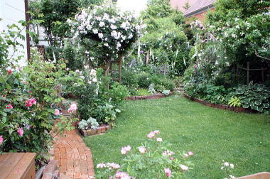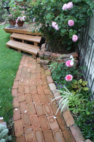 ここにもレンガ道が出来、ますます薔薇が進出してきました。 このピンクの薔薇は、Harlow Carr。
