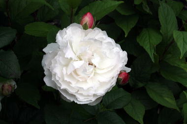 薔薇は「群星」。蕾の先がほんのりと赤く、咲くと純白の小輪セミダブル。たわわに咲く姿はまさに群れなす星、圧巻です。