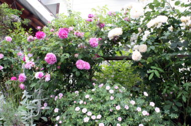 右側の白く見える淡いアプリコット色の薔薇はER Gentle Hermione。コロンとした優美なカップ咲き、丈夫で冬枯れもせず、何より四季咲きなのがこのコーナーには嬉しい。