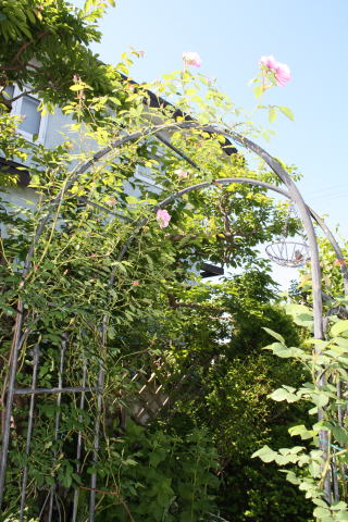 ブラッシュ・ブールソール、我が家のニューフェイスです。昨年出来たサークルエリアにアーチを立てて、さあここに這わすツルバラは?と物色している私に、「長尺ツルバラ」というなんとも嬉しい薔薇が目につきました。長く伸びた花つきのツルバラがガーデンセンターに売られていたのです。しかもその花の可愛らしさ!トゲもなくしなやかに伸びた枝からは、垂れ下がって咲くアーチにぴったりのソフトピンクの小ぶりな花が!当然ながら少々お高めでしたが、もう心とらわれてしまったら止まりません。冬越しの心配もありましたが、連れ帰ってしまいました。