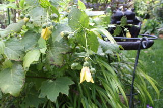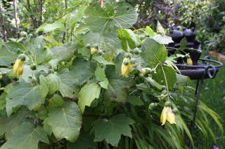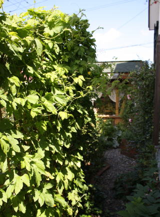 7月の薔薇の最盛期が終わると、わが家の庭では薔薇の木の間を野菜が這い回ります。