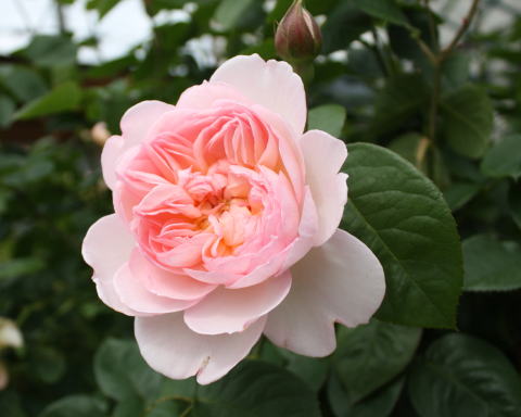 ガーデンシェッドとお似合いの薔薇はイングリッシュローズのジェントル・ハーマオニー。白に近いアプリコットピンクの色合い、ミルラの香り、花つき、健康さ、どれをとっても素晴らしい大お気に入りの薔薇です。