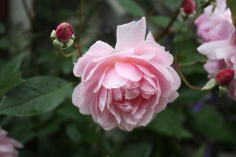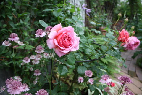 アストランティア’ローマ’と一緒に、淡い色合いが我が家のピカイチ美人薔薇さんを引き立てます。