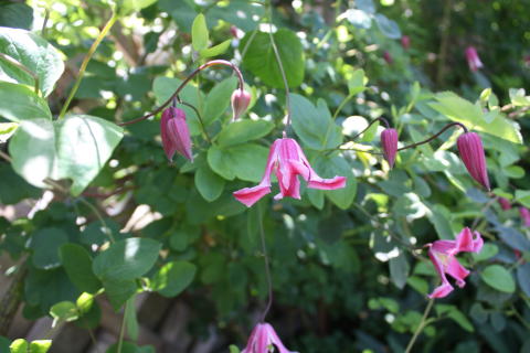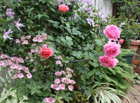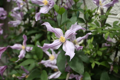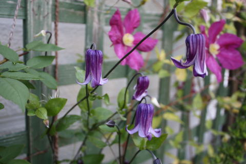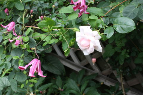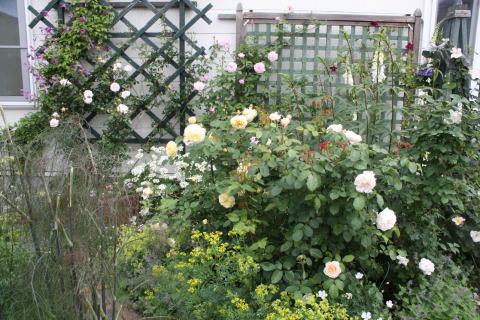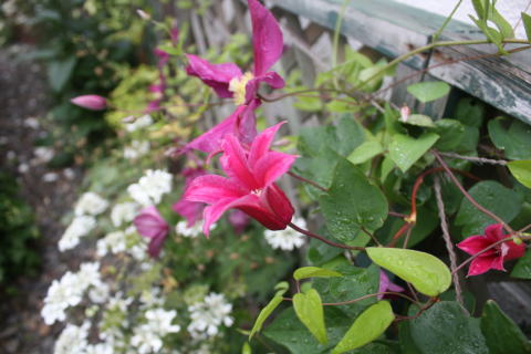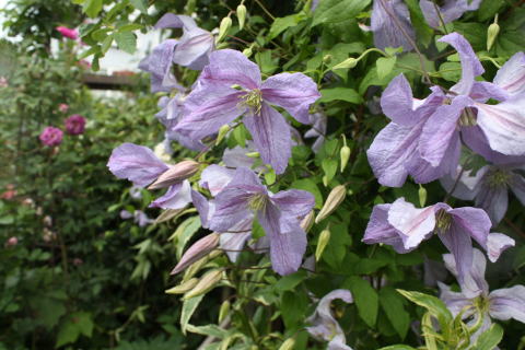 クレマチスは庭のあちこちに。「あなたの薔薇の庭にクレマチスを植えましょう。薔薇と咲く時期が同じというだけでなく、病気も同じなのでお手入れが一緒で楽です」と昔イギリスの園芸誌で見て以来、我が家はクレマチスだらけ。夏の気温が低く薔薇の咲き具合がいまひとつ、なんて年でも、クレマチスの華やかさがしっかり庭をカバーしてくれます。