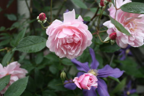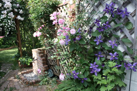 薔薇にないブルー系の色合いもクレマチスは豊富。ピンク系の薔薇とクレマチスの青が混じり合うと、夢見るロマンティックガーデンにまた一歩近づいている予感。