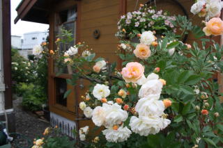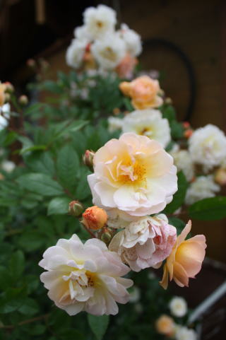 ガーデンシェッド戸口に植えたGhislaine de Feligonde、この場所に馴染んで大きく育ち、見栄えよくなってきました。今シーズンは花付きもよく、シェッドのウェルカムローズとしても大活躍。可憐でいて華やかなオレンジ混じりのクリームイエローがひときわ鮮やかです。