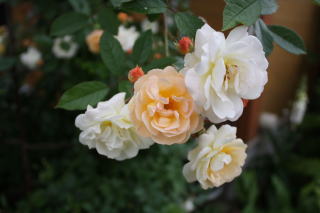 咲き始めは赤みがかったオレンジ色。開花直後はアプリコット。咲き進むに従ってクリームイエローから最後は真っ白に。