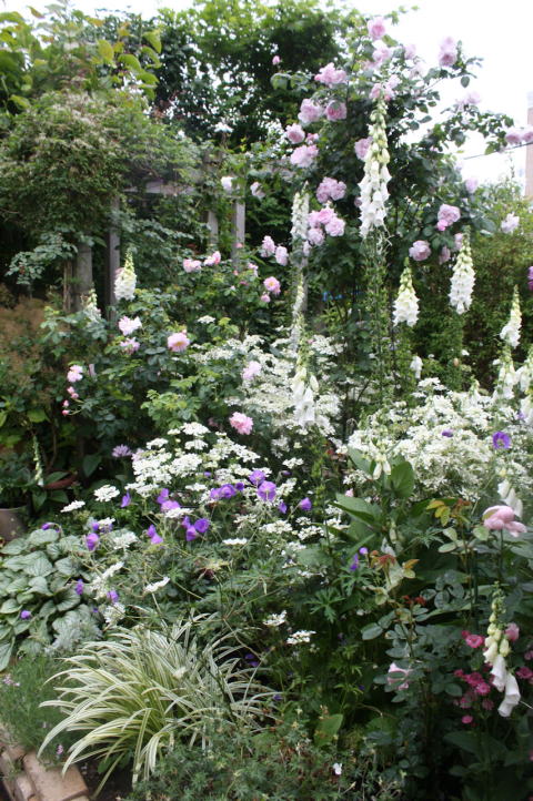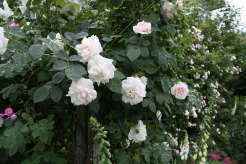 西のメイン・ガーデンはパーゴラ・コーナー。脇のオベリスクにはファンタン・ラトゥールが駆け上ります。色合いも花びらの重なりぐあいも、これぞオールドローズと私がイメージする通りの薔薇。香りもみごとなまでのオールドローズ香です。