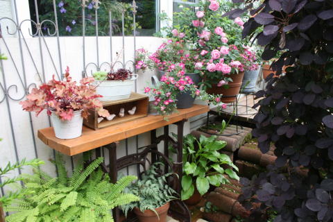 今シーズン、いきなり我が家にやってきた古ミシン台。前から気になっていたレッドコーナーの背景に活躍してもらうことにしました。古材で白壁を作り、砂利を取り除いてレンガを敷き、それっぽく鉢物を並べると、、、。いつも決まらなかった赤バラの背景が、ちょっとアンティークな雑貨屋さんの雰囲気っぽいと本人は大満足です!