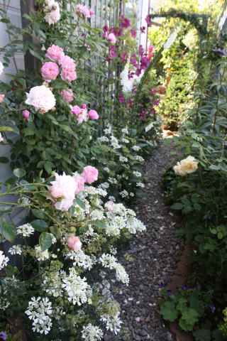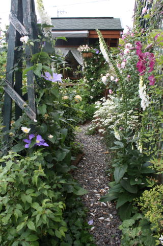 ガーデンシェッドへと続く小道は砂利道で、そのうちレンガに変えようと思いつつ、結局このまま。花の季節にはこのひなびた雰囲気もいいかな、とこれからもこのまま???