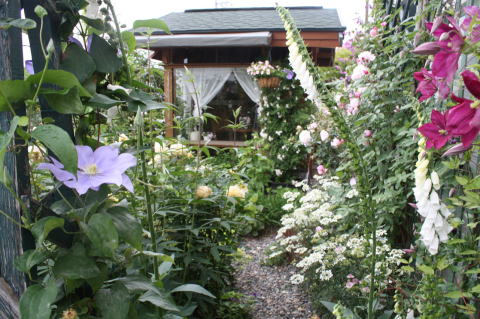 ガーデンシェッド前の庭は、実はクレマチスガーデン。薔薇の季節にはクレマチスも一斉に咲き競います。