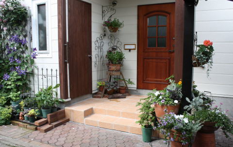 ただのコンクリートむき出しだった玄関前のたたきは、長年の憧れ、レンガ色のタイル敷きになりました。もちろん我が家の左官屋、夫作です。おかげさまで、玄関前の寄せ植えもやっと見栄えがするように。
