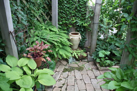 日当たりの悪い足元には、クジャクシダ、ニシキシダ、ギボウシ。