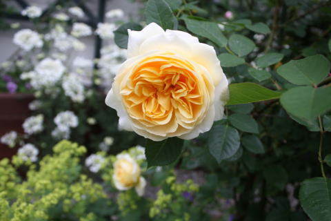 クレマチス’ミルキーウェイ’が咲くのは、イングリッシュローズ’Princess Alexandra of Kent'の壁面。なかなかうまく2ショットが撮れませんが、後方で咲いているのがわかりますか?