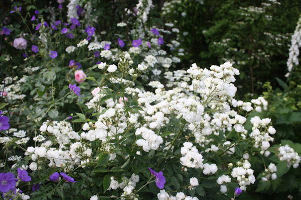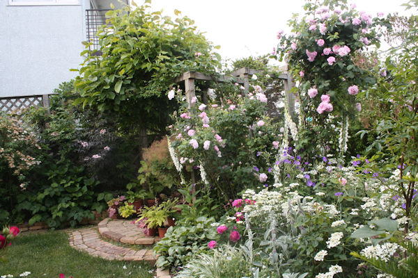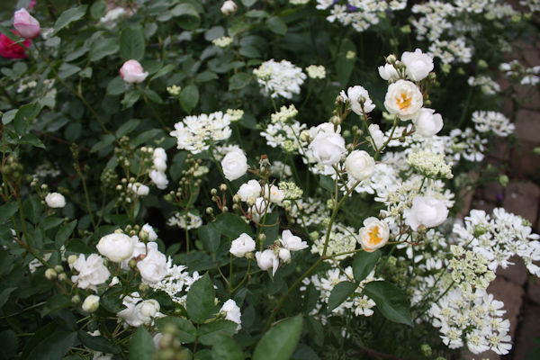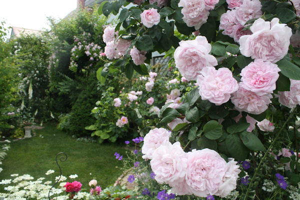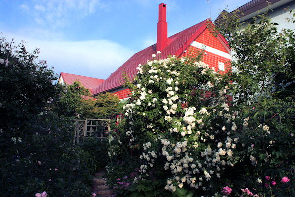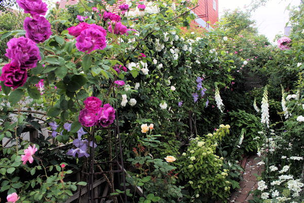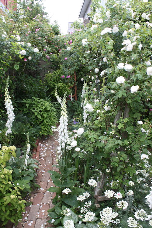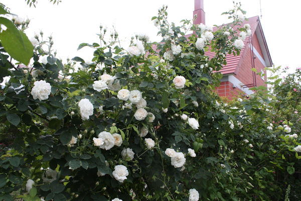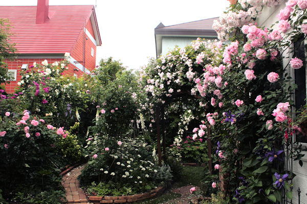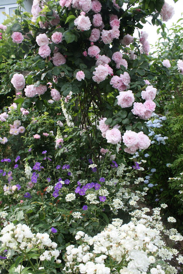 長年思い描いていてもなかなか思うようには育たなかったのですがやっと樹が円熟したのか、モーティマー・サックラーは家の壁を彩り、ヒマラヤンムスクはベランダに駆け上がり、とダイナミックな仕上がりに。長年の夢がやっと実現しました。
