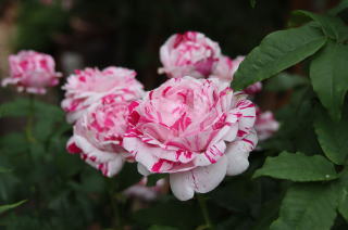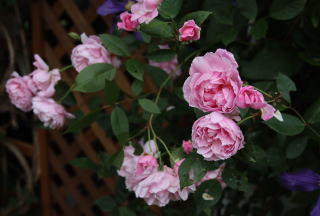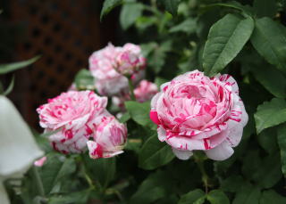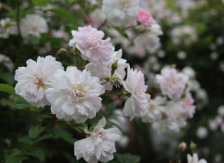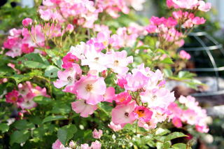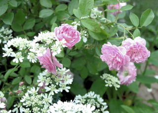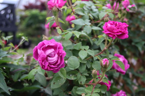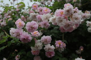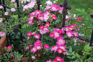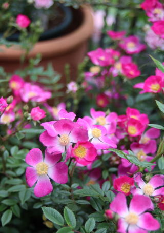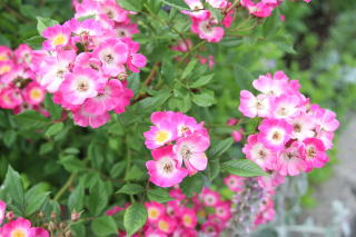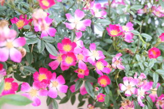 | 小輪一重の薔薇ですが繰り返して咲き、秋の花付きもみごとです。オレンジがかったまん丸の実も付けます。北海道でもアーチになるようですが我家では伸張1.2mほど。庭の彩りに植えていますが、写真は鉢植えで重宝しています。トゲは少な目ですが時々きついトゲがあちこちに。明るい葉色も特徴的です。 | アーチにと期待した薔薇でしたが我家では伸張80cmほど。冬枯れもするため鉢植えで育てています。マジェンタ色が強いピンクの小輪はバレリーナよりさらに小ぶり。葉の色あいも青みがかって、和風の景色にとても似合うシックな薔薇です。少し繰り返し咲きします。 | 本州では2階まで伸びるようですが我家では1.2mほど。冬枯れもするのでブッシュ薔薇の扱いです。絞りの着物のような縁が濃いピンク中心が白い小花が房咲きで咲きます。わずかに繰り返し咲きします。葉色も明るく、洋風にも和風の庭にも合います。 |
