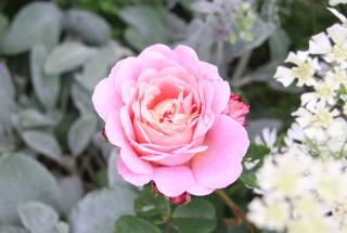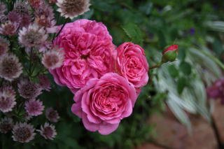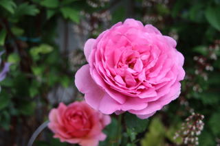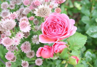 | 驚きの薔薇といえばこの薔薇!ずっと地植えにしていて調子も悪く、まともに咲いた姿も見たことがありませんでした。昨年鉢上げしてクレマチス'Milky Way'と並べた途端、この気品です!なんて可愛い!遅咲きですが繰り返し咲き。Milky Wayに似合うライラック色を帯びたピンク色。70cm×50cm。冬枯れしやすいため、雪囲いは覆いも必要です。 | 庭に華やかさが欲しいと思ったら迷わずこの薔薇!名前まで華やか。チェリーピンクの大型の花はアストランティア’ベニス’を従えて女王の気品です。70cm×50cmほどと樹形はコンパクト。冬枯れもするので覆いが必要です。繰り返し咲き。微香。 うちでは花付きがあまりよくありませんが、一輪咲くだけで存在感があります。 |