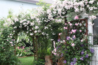 この2つの薔薇は全くの新顔さん。中央のアーチ下に植えたら、いきなり雰囲気が変わりました!