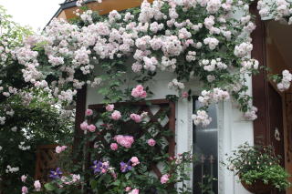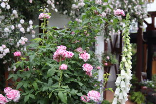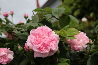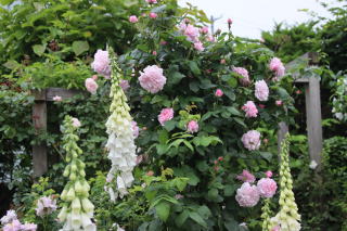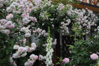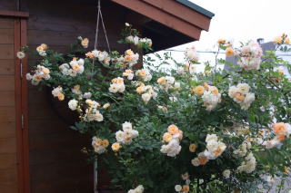 シェッドを彩る薔薇として定着してくれたGhislaine。シェッドを覆うほどの薔薇も憧れですが、この華やかさならシェッドはこの薔薇におまかせ。