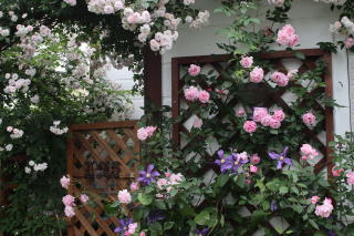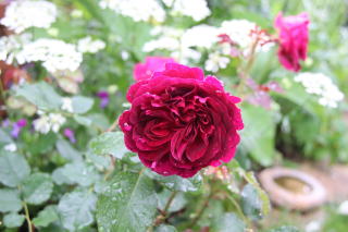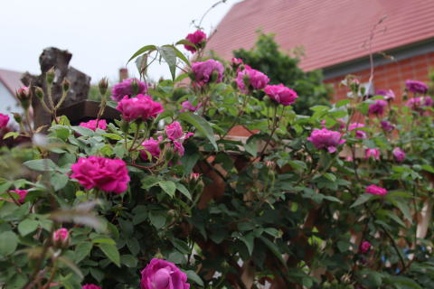 ずっと地味な薔薇という印象だったのですが、トレリスの主役にした途端、薔薇ってこんなに華やぐものなんですね〜!色合いさえも紫からベルベット深紅に。まだまだ奥が深い薔薇栽培です。