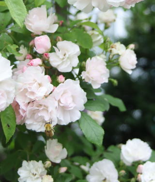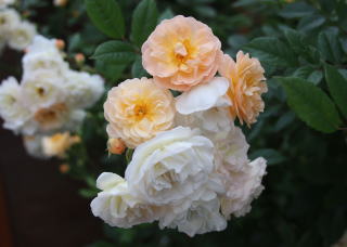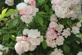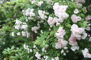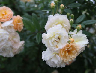 | ヒマラヤという名は寒さに強いから?よく伸びるから?十分両方の特徴を発揮して香り高い房咲きの花を限りなく伸ばします。トゲが多少きついですが、それを無視できる花形の可愛らしさ。ほんのりピンク色を帯びた八重の花は先進むと真っ白に。あたり一面かぐわしい香りに包まれます。伸張5m。冬囲いも特にしません。トゲさえがまんすれば100点満点の薔薇です。一季咲き。 | つぼみの先がほんのり赤く、開きかけはピンク色、咲くと純白の色あいになる魅力的な薔薇です。しかもトゲがまったくありません。「群星」という名前の通り、蕾の混じる花の時季は夜空にちりばめられた星々のようです。香りの無いのが残念ですが、トゲが無いので差し引きゼロ!?葉色も明るく花の咲く前もきれいな庭木です。伸張3m。束ねるだけですが冬枯れもせず、大株になると小山のように垂れます。一季咲き。 | 蕾はオレンジ色。咲き始めはアプリコット。先進むと白い房になり、一株だけで花束のようです。多少返り咲くのも嬉しい薔薇。トゲもそれほどきつくありません。微香。我家では北側の日があまり当たらない場所ですが、花付きもよく束ねる程度の冬囲いですが元気に冬越しします。夏場2mほどの枝を伸ばしますが、枝先は冬枯れし、1.5mほどに仕立てています。 |