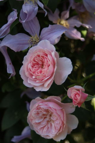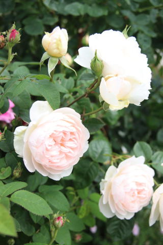 好きな薔薇の筆頭にあげられるのがこの薔薇。ふくよかな花形も中心がほんのりピンクの優しい花色も大好き!名前の由来のシェイクスピア「冬物語」。王妃が登場する最後の場面は涙なしには語れません。なによりお気に入りなのは、この薔薇の強さ。冬枯れもせず病気にも強く、花付きも抜群。早咲きですがシーズン後半にもまたすぐにミルラの香高い花を次々と咲かせます。100cm×80cm。 |