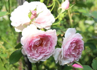 | 絞りの薔薇もいろいろありますが、白と赤の割合が一番私には好みの色合い。うっとりするほどのオールドローズ香。よく伸びてオベリスクに仕立てていますが、枝先が冬枯れするため、雪の下になるように横倒しに冬囲いします。2m×70cm。秋に稀に返り咲きすることも。 | オールドローズの中では群を抜いた華やかさと気品を兼ね備えて、遠くからでもひと目を引きます。ティー香の混じるオールドローズ香も素晴らしく、我家のシャーベット薔薇に定着しました。葉の色も明るく、トゲも少な目。庭の中心的存在です。1.8m×60cm。冬枯れもするので雪囲いと覆いが必要です。 |