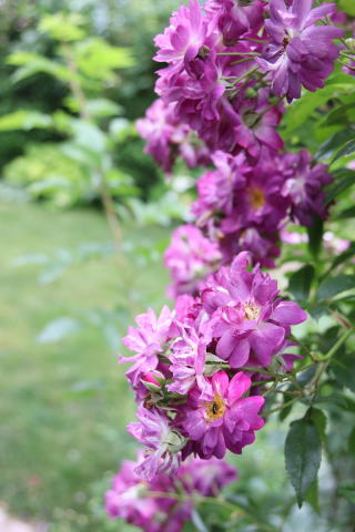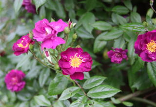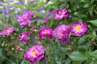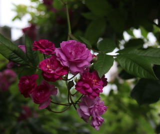 | 紫というよりは臙じ色と言った方が近い明るい紫系のツルバラです。3つの中では一番早く6月末に開花。黄色の中心が目立つセミダブルの花が房になって咲きます。トゲも少なく扱いやすいツルバラ。伸張2mほど。寒さにも強いですが、冬は覆いが必要です。我家ではオベリスク仕立て。赤コーナーの背景にぴったり。 | 3つの中で一番紫色が濃いツルバラです。特に散り際には黒みがかるほどの濃紫に。開花は北海道の我家で7月上旬。花びらが不規則に乱れる花形も風情があります。秋にはたっぷりと実も付けます。トゲは少なく扱いやすい。3mにも伸びますが-20℃ほどの寒風にさらすと枝枯れするため、なるべく雪の下になるように弓型に冬囲いします。西のアーチを覆うほどの枝ぶり。 | 7月半ばに開花する我家の薔薇の中でも一番遅咲きのツルバラ。丸弁ダブルの花がたわわな房咲きになります。日陰にも強く、やや明るめの紫が木陰を彩ります。トゲは少な目。伸張3m。冬は雪の下になるように束ねて越冬させます。他の2つよりもコロンとした花形、遅咲きということもあって可愛い末っ子薔薇です。 |