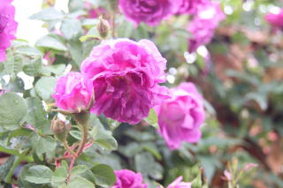 | ERの中では小ぶりな中輪の花は房咲きに咲くととても華やか。ライラック色を帯びた鮮やかなピンク色が目を引きます。樹形は80cmx80cmほど。枝のトゲがびっしりときついのが残念ですが、オールドローズ香に惹かれて植えました。何度も返り咲き、秋の色はさらに鮮やか。冬枯れはわずかですが、細い枝ぶりなので雪囲いはしっかりします。 北海道に向く植物を探して、寒冷地の植物を植えているというヨークシャーのハーロウ・カー植物園を訪れたことを思い出します。 |