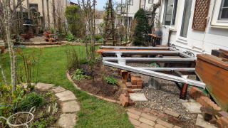 前庭のウッドデッキは床板が腐って、前面撤去。5月上旬の段階では基礎のみ。。。
