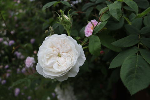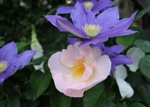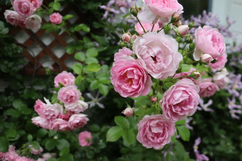 ガーデンシェッド前の庭には、その昔、このサイトの扉写真に採用したお似合いの取り合わせ、ERのシュロップシャー・ラスとクレマチス’藤娘’を植えています。