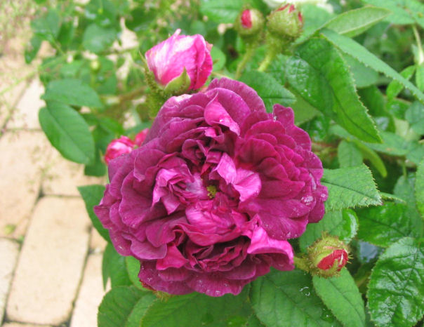 赤紫に近い濃い紫の花をつけるモスローズ。一季咲き。