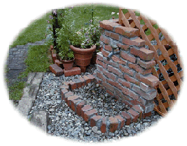 ![]() | 古レンガを積んで仮完成。一冬越して地盤が安定したらモルタル仕上げをします。緑濃い花の季節になり、レンガの水場が庭にしっくりとけ込みました。 | ![]() |