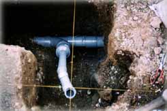 ![]() | はめ込んだ後、水漏れしないよう ていねいに接着します。この 作業が一苦労。下水の匂い に耐えながらの穴蔵仕事です。 |